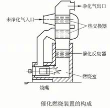 催化燃燒裝置主要由熱交換器、燃燒室、催化反應器、熱回收系統和凈化煙氣的排放煙囪等部分組成,如右圖所示。其凈化原理是:未凈化氣體在進入燃燒室以前,先經過熱交換器被預熱后送至燃燒室,在燃燒室內達到所要求的反應溫度,氧化反應在催化反應器中進行,凈化后煙氣經熱交換器釋放出部分熱量,再由煙囪排入大氣。